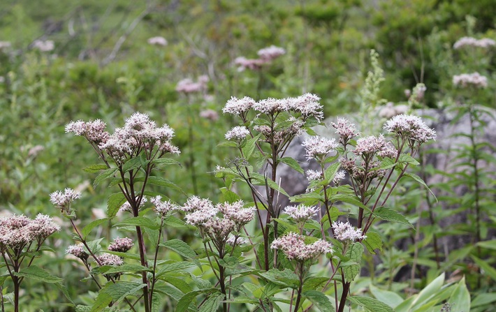 ー 蝶や昆虫が蜜を求めて集まる ヨツバヒヨドリ 群落があちこちに見られる ー
