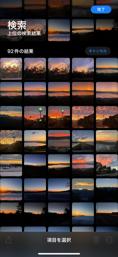 中川屋のスマフォの中には約9,000枚の写真が保管されているのですが、その中で『夕焼け』で該当したものは92件。ちなみに『朝焼け』も拾ってくれていました。