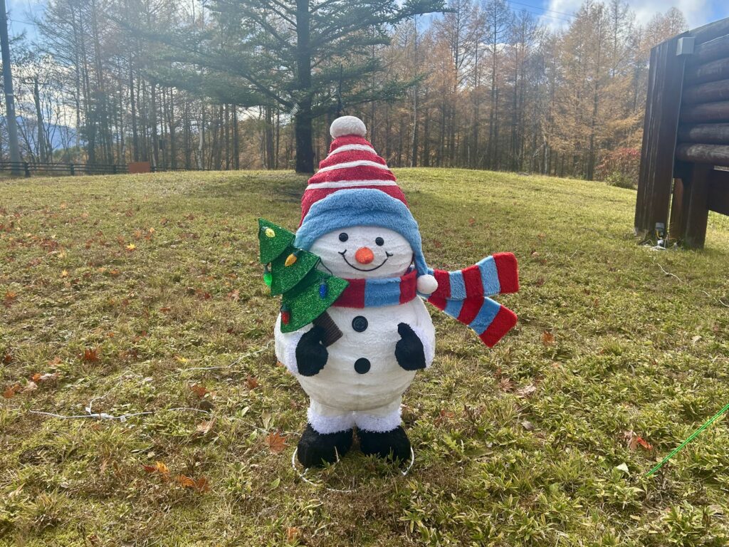 入口の看板横には、今年もスノーマンのイルミネーションを設置しました。
