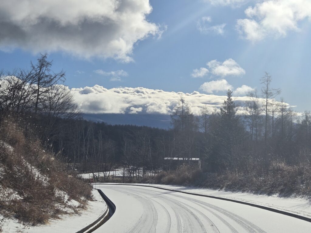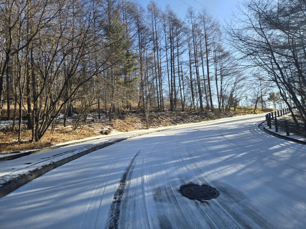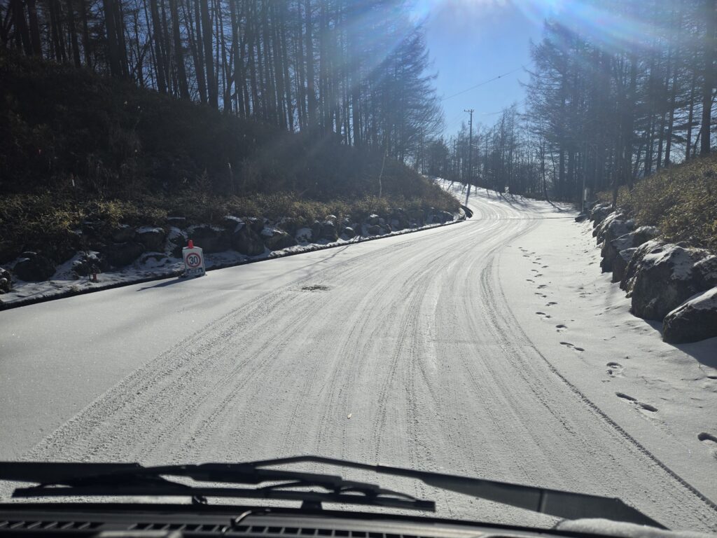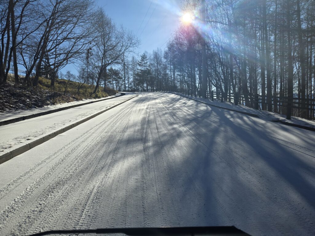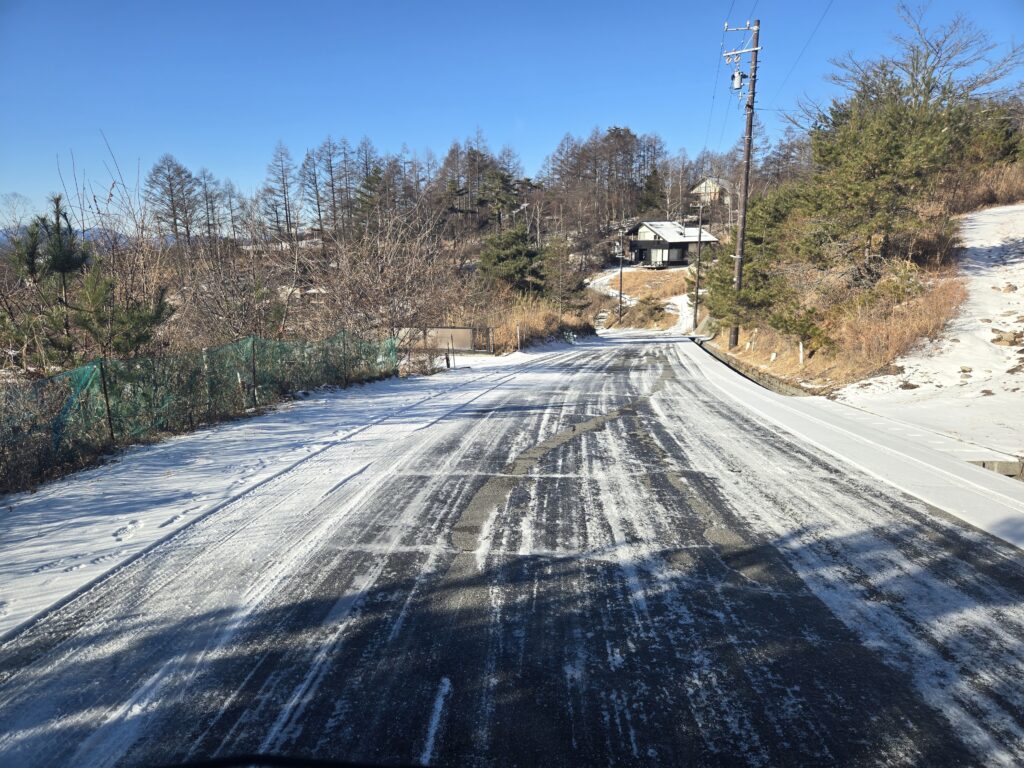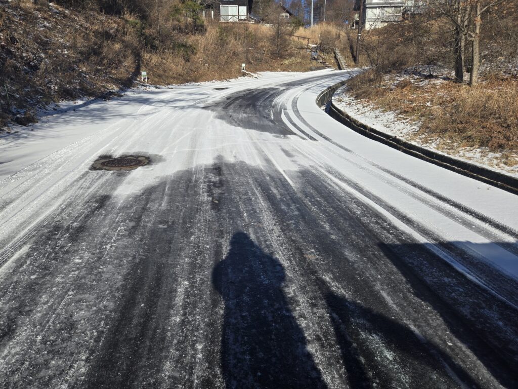 今回は雪ではありませんが道が凍って、むしろ滑りやすくなっています。