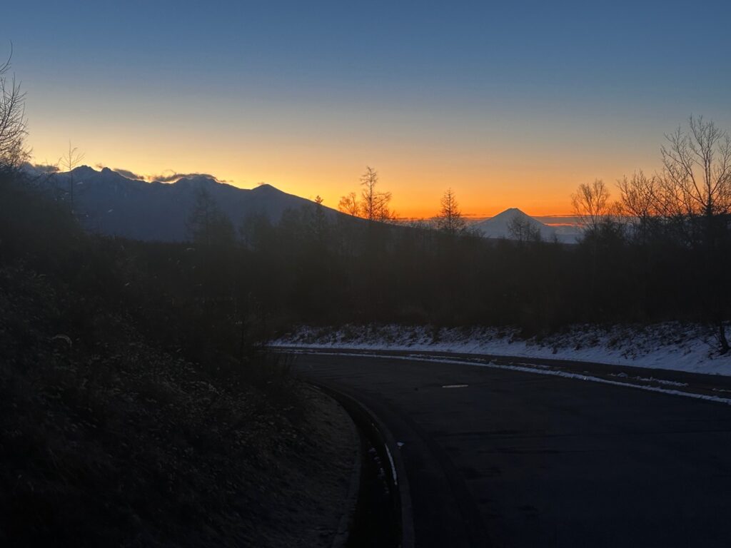 天と地を斜めに隔てる長い裾野の先に、ひと際高い富士山のシルエット。