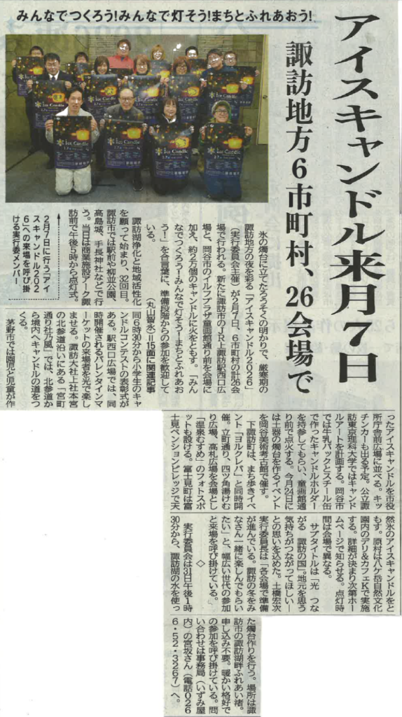 今日は地元の冬のイベントを紹介します。まずは2月7日にアイスキャンドルが諏訪地域の多くの場所で行われます。冬のイベントはあまりないため諏訪地域の代表的なイベントです。
