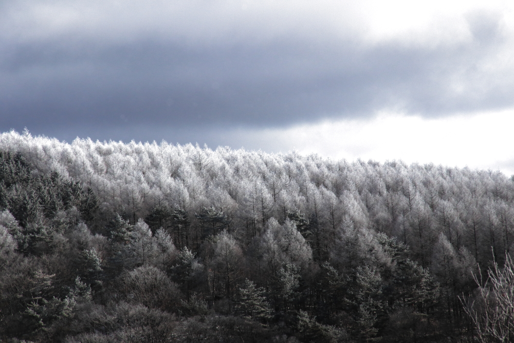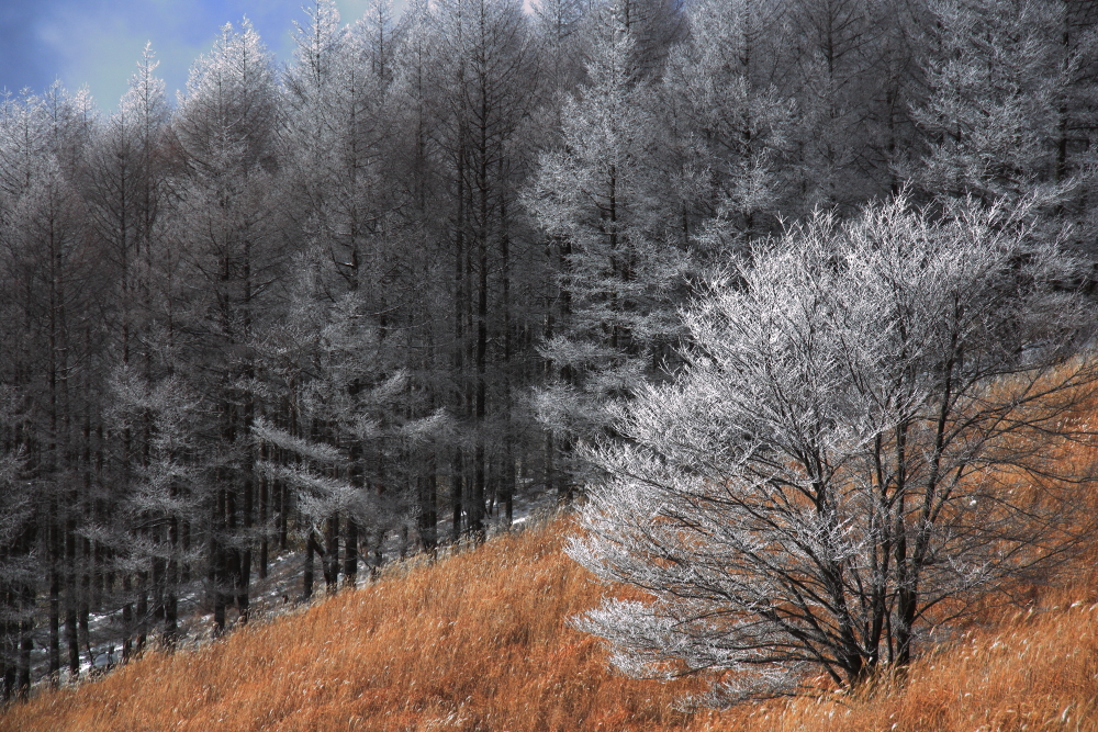 ビバルデの丘に隣接する「踊り場湿原(池のくるみ)」方向を見れば、霧氷化したカラマツの山でした。